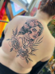 My preferred style of tattooing is feminine black and gray. Some of my favorite subject matters to tattoo are flowers, moths, butterflies, lady faces. or ornamental pieces. I also love anything spooky/witchy. I always prioritize my flash over custom appointments.